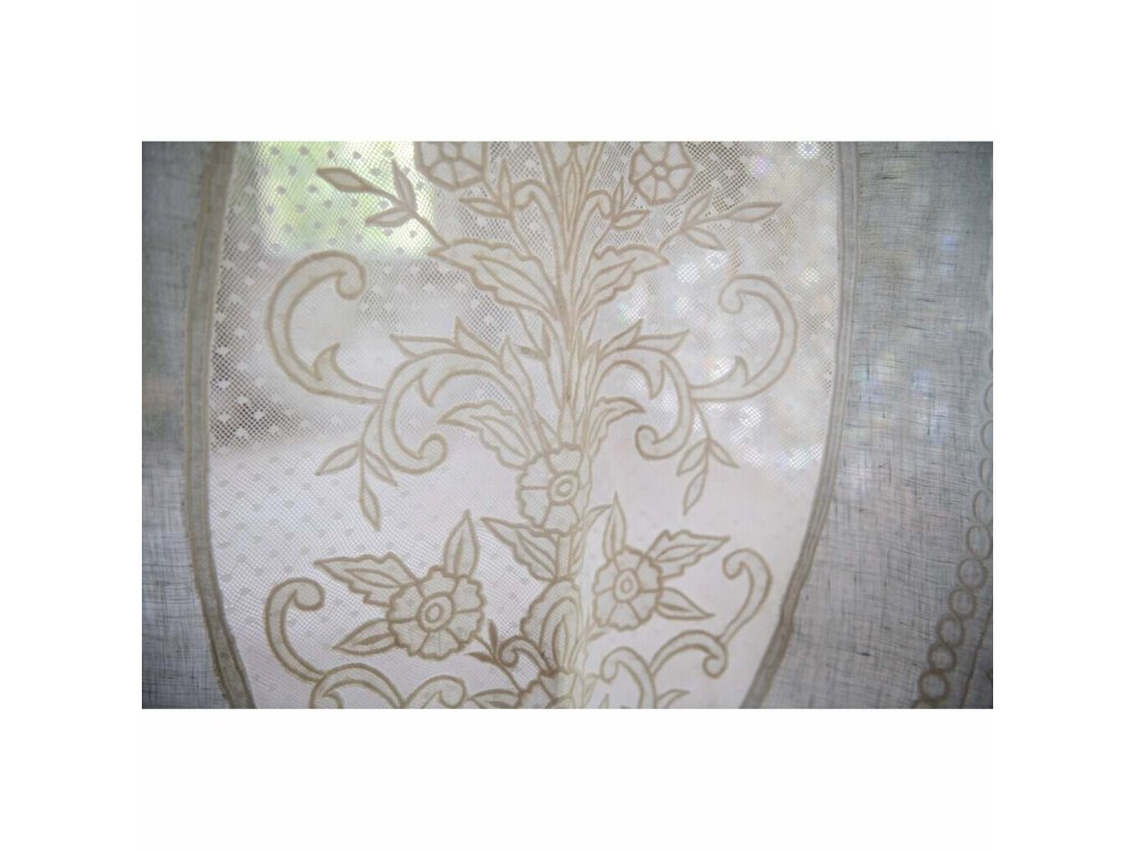 Штора, на тканевых завязках, из льна 100%, с вышивкой в центре. Цвет полотна — светлый ментол, вышивка аппликация белого цвета.