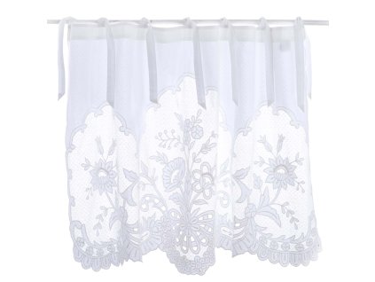 Короткая штора или прекрасный ламбрекен из хлопка белого цвета, на тканевых завязках, украшена шикарной вышивкой и аппликацией на сетке.