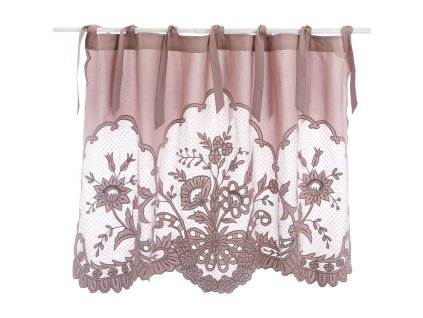 Короткая штора или прекрасный ламбрекен из хлопка, цвета пыльной розы, на тканевых завязках, украшена шикарной вышивкой и аппликацией на сетке.